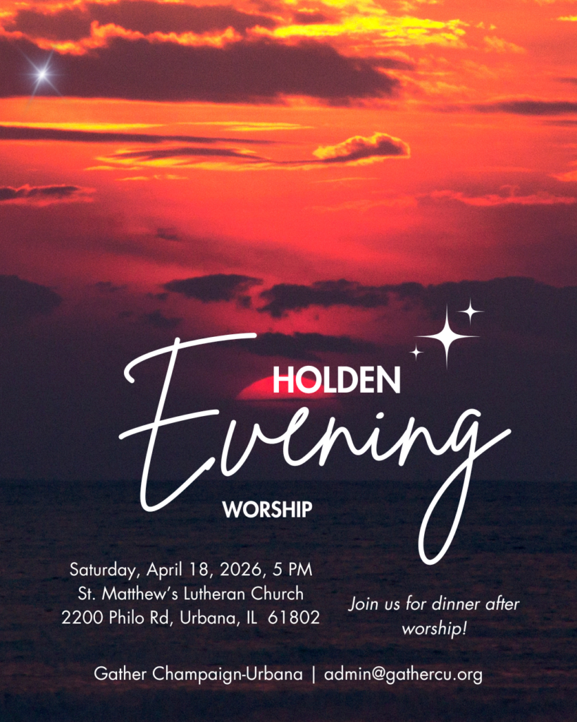 Join us on Saturday, April 18, at 5 PM for Holden Evening Prayer at St. Matthew’s Lutheran Church in Urbana. This is a peaceful, music-filled service that is part of a worldwide celebration of Holden Evening Prayer. No musical experience is needed; everyone is welcome to listen or sing along. After the service, we will go out to dinner together (most likely Casa Del Mar). Parking is available at the church, and the closest bus stop is McHenry & Philo (SW Corner). We can also help arrange rides if needed. Hope to see you there!
